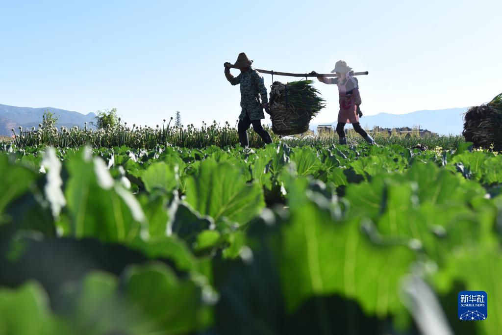 4月4日,農民在云南省麗江市玉龍納西族自治縣黃山街道的農田里搬運蔬菜。
