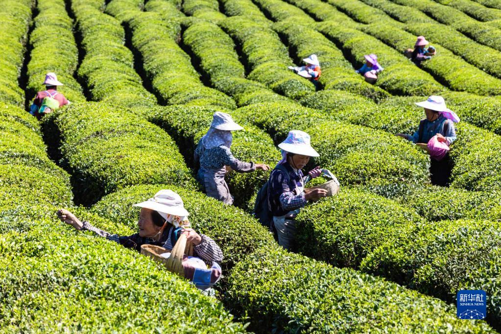4月4日,茶農在貴州省安順市西秀區雙堡鎮一茶園采摘明前茶。