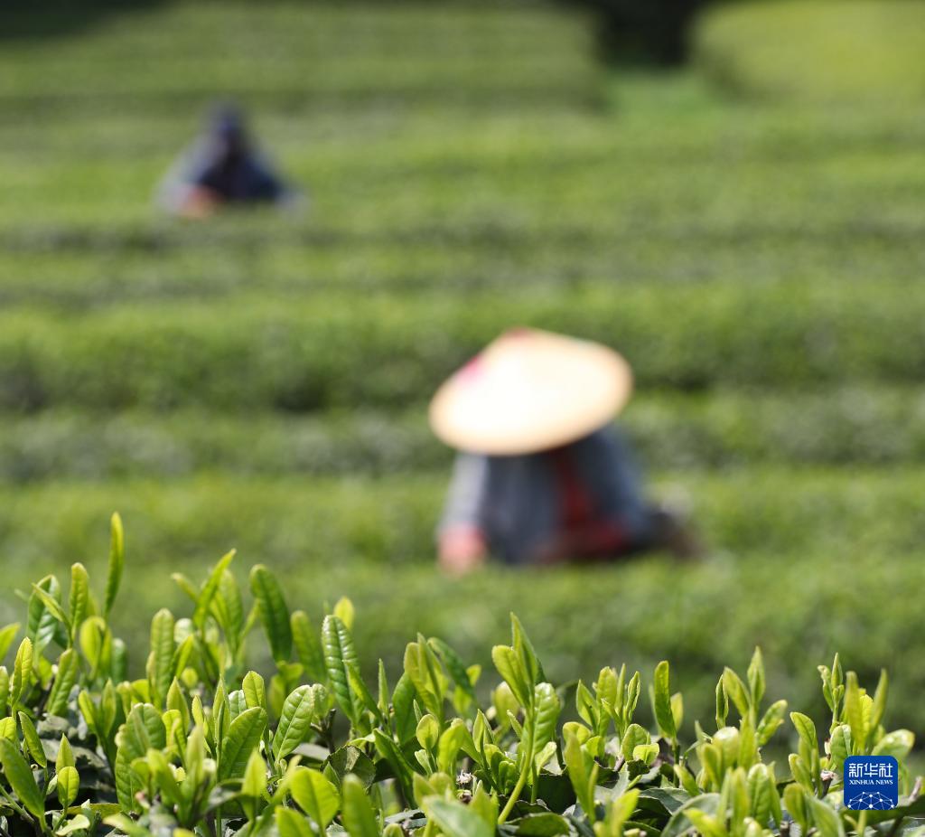 4月4日,茶農在貴州省貴陽(yáng)市開(kāi)陽(yáng)縣南龍鄉田坎村一生態(tài)茶園采摘春茶。
