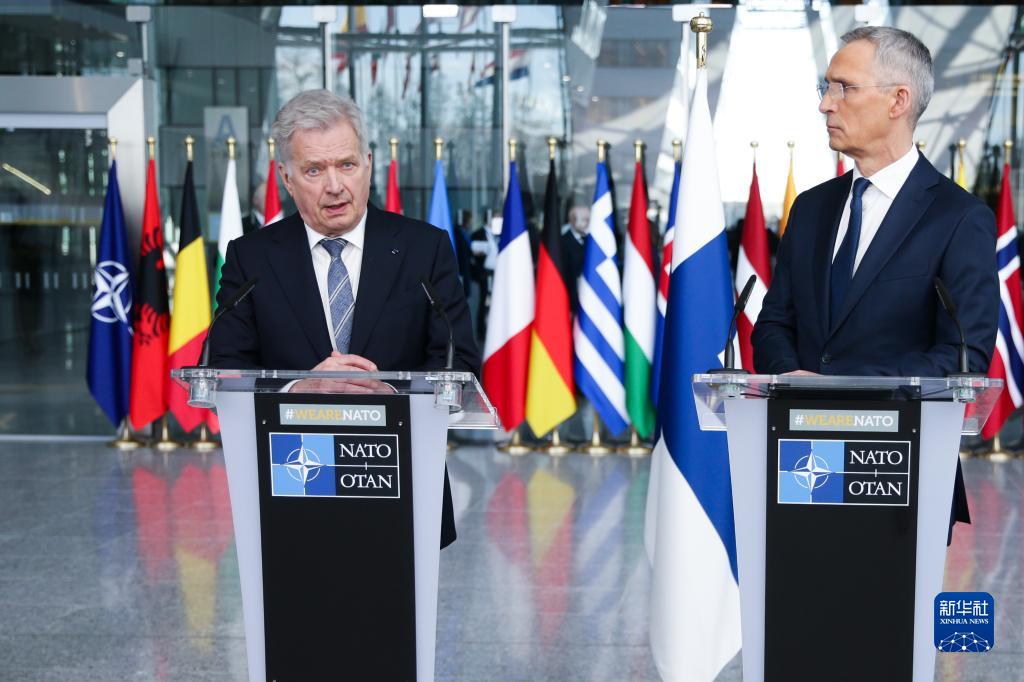 4月4日,在比利時(shí)布魯塞爾的北約總部,芬蘭總統尼尼斯托(左)和北約秘書(shū)長(cháng)斯托爾滕貝格對媒體發(fā)言。