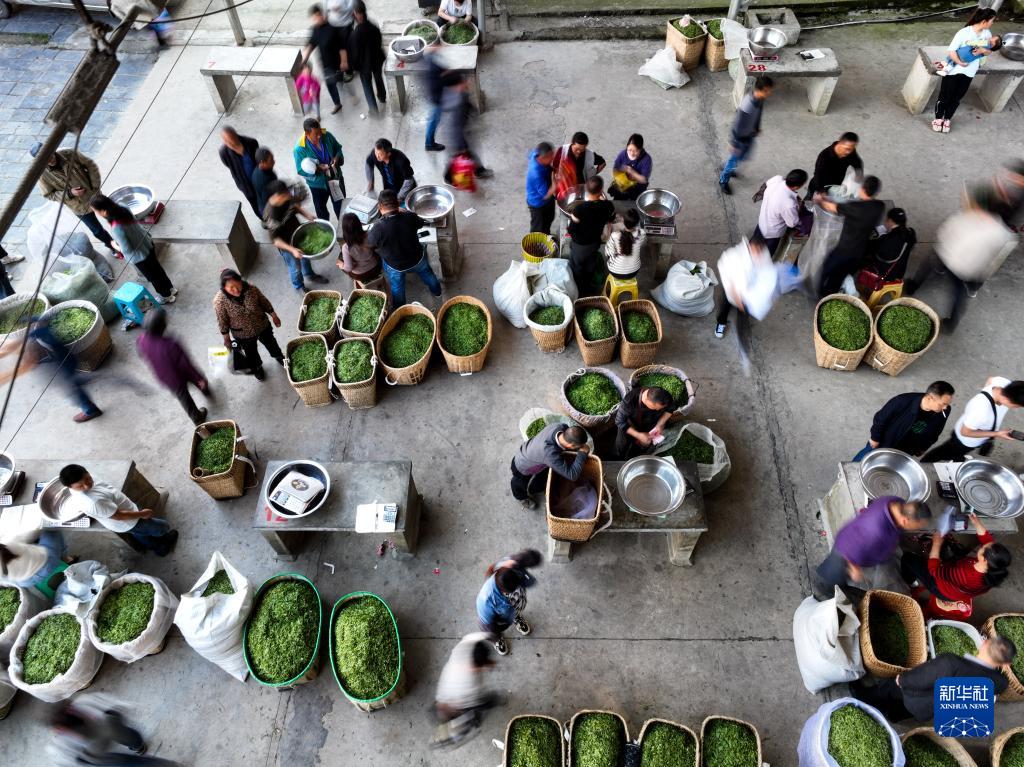 4月4日,茶商在遵義市湄潭縣湄江茶青交易市場(chǎng)內收購茶青(無(wú)人機照片)。