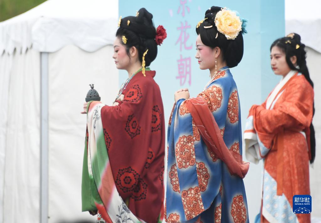 4月5日在北京世界花卉大觀(guān)園拍攝的漢服表演。