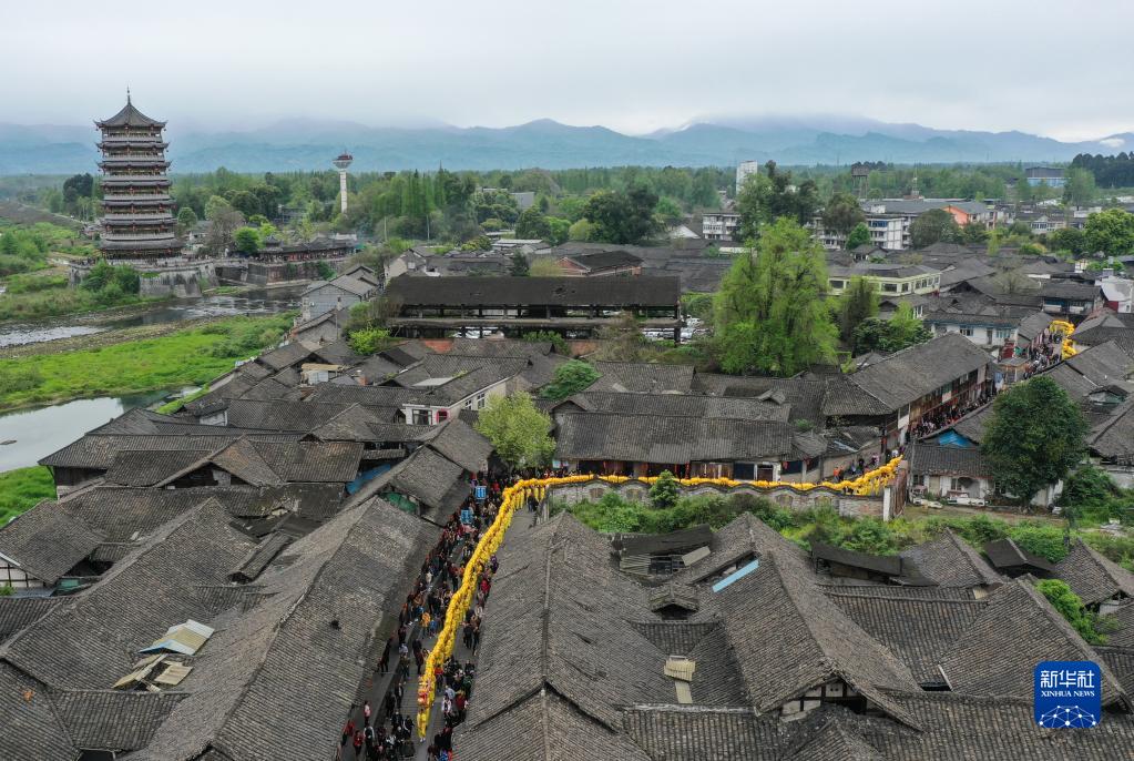 當日,崇州元通清明春臺會(huì )在四川成都崇州市元通古鎮拉開(kāi)帷幕。由269人手舉269截龍身匯聚成的“匯江老龍”,在古街上巡游。