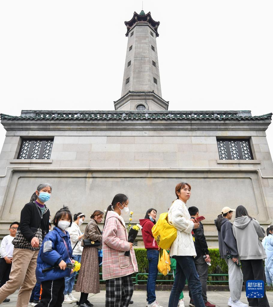 4月5日,市民在湖南烈士公園的紀念塔前排隊獻花。