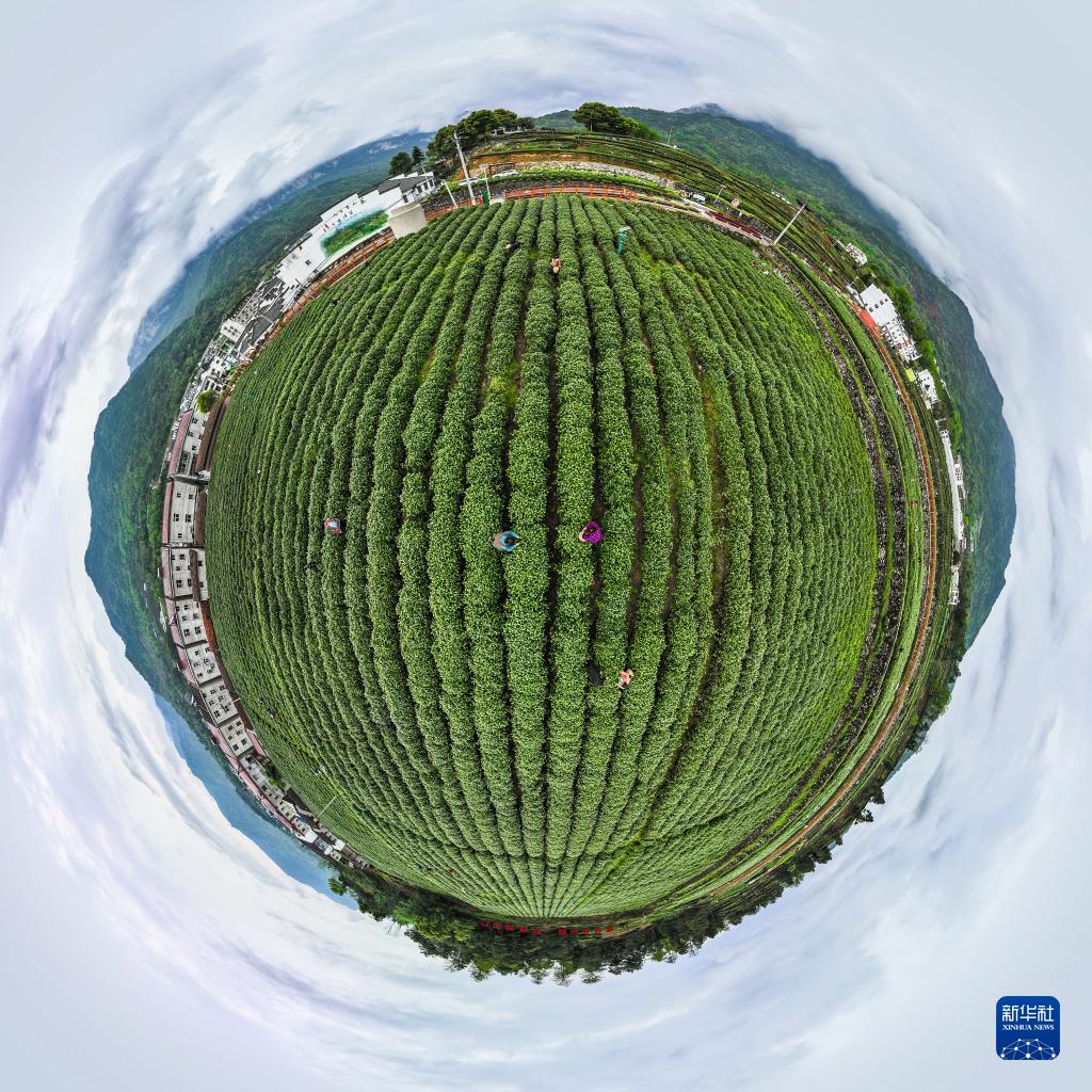 4月5日,茶農在湖北省宜昌市秭歸縣茅坪鎮建東村茶園采茶(無(wú)人機全景照片)。
