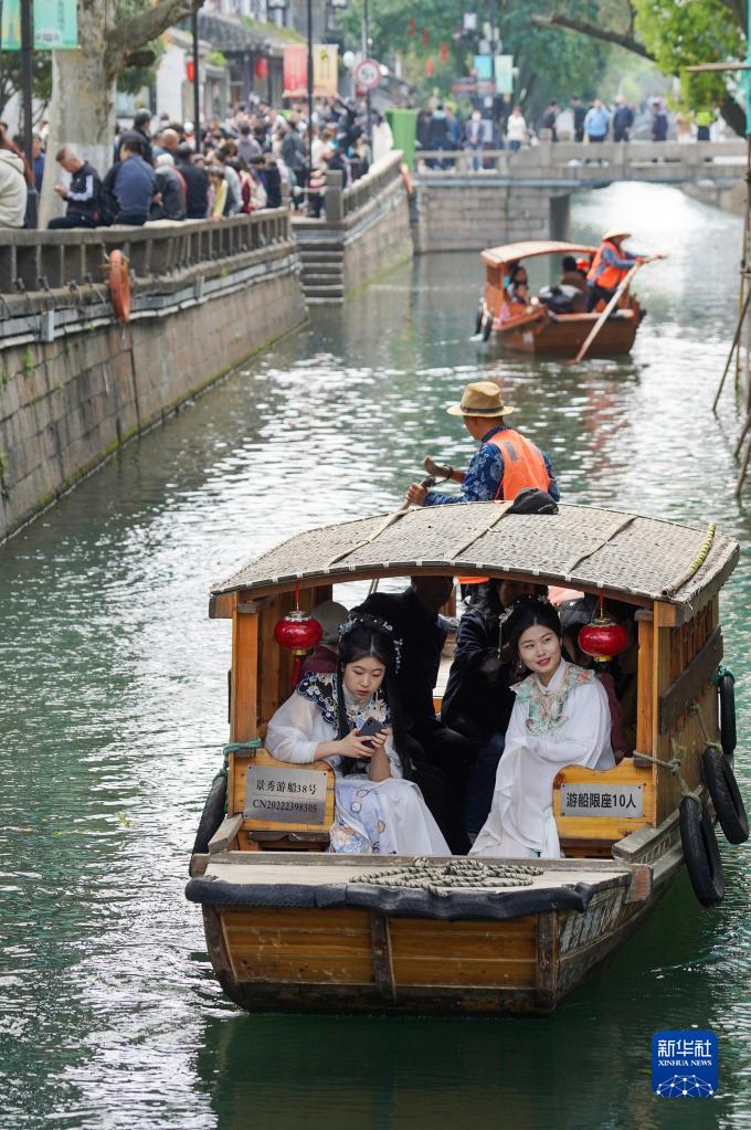 4月5日,游人在江蘇蘇州平江歷史街區乘船游覽。