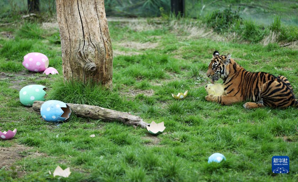 4月5日,在英國倫敦動(dòng)物園,一只蘇門(mén)答臘虎享用“彩蛋大餐”。