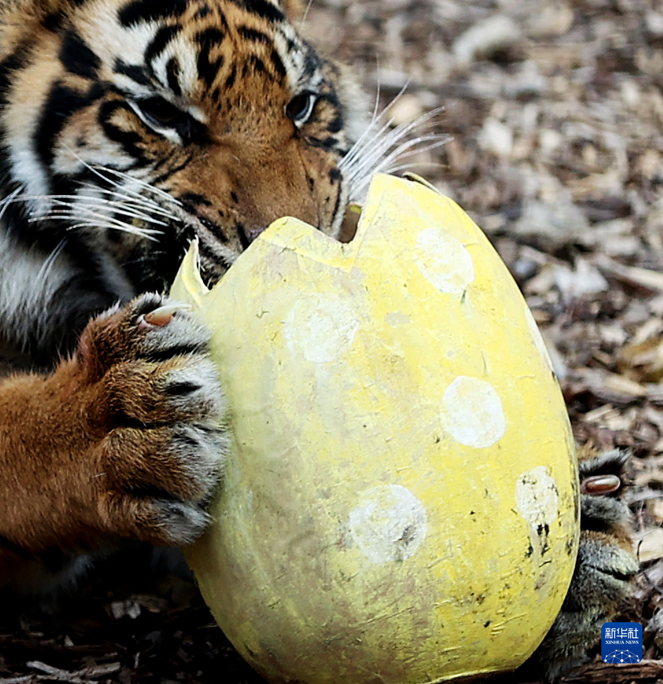 4月5日,在英國倫敦動(dòng)物園,一只蘇門(mén)答臘虎享用“彩蛋大餐”。