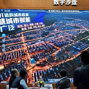 4月6日,參觀(guān)者在展會(huì )上體驗數字沙盤(pán)。