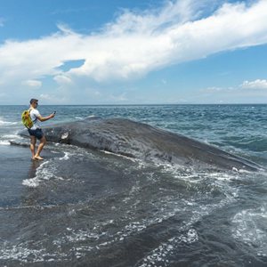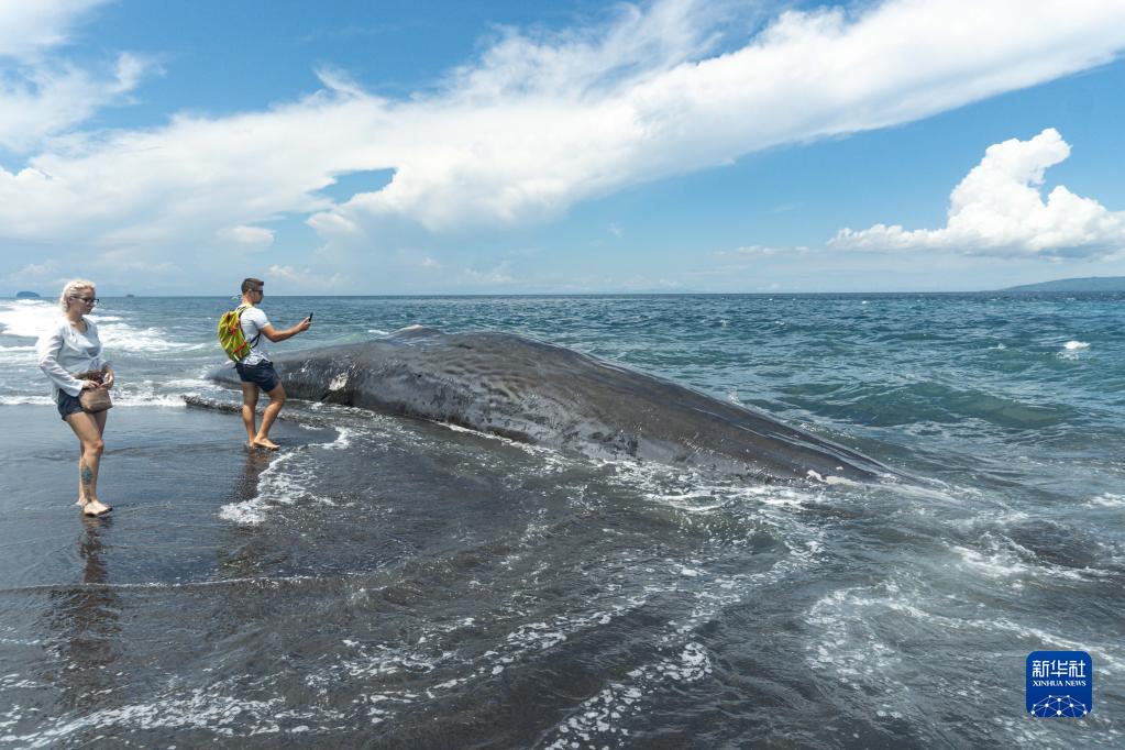 4月6日,在印度尼西亞巴厘島克隆孔,人們圍觀(guān)抹香鯨的遺體。