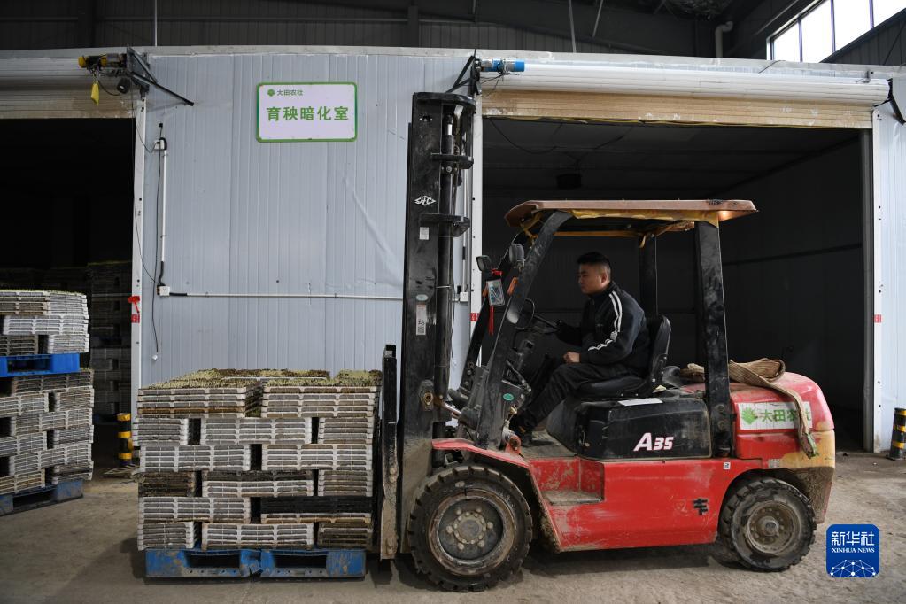 4月6日,在江西省南昌縣蔣巷鎮大田農社育秧生產(chǎn)車(chē)間,工人駕駛叉車(chē)轉運暗化催芽好的秧苗。