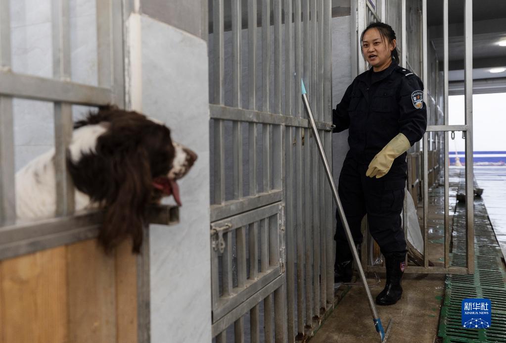 4月3日,警犬康欣看著(zhù)劉欣打掃犬舍。新華社記者 費茂華 攝