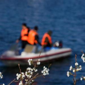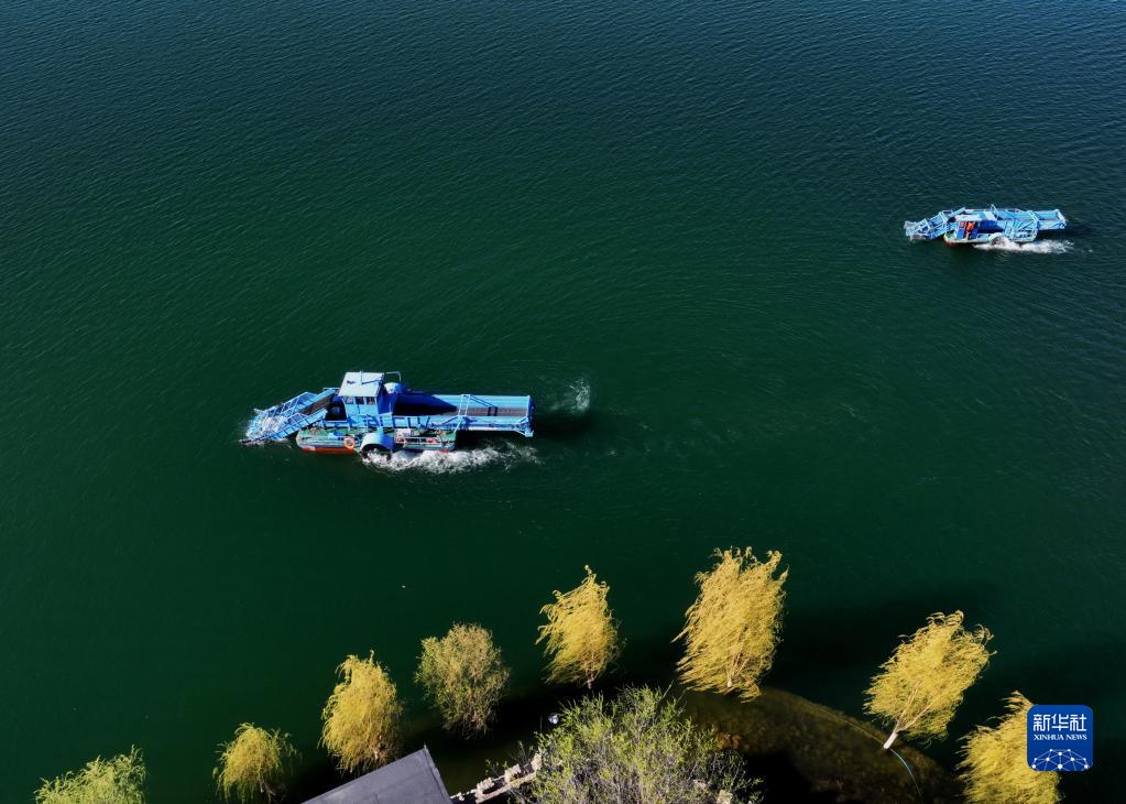 4月7日,河北省遵化市上關(guān)湖管理部門(mén)的工人操作專(zhuān)業(yè)打撈船在湖面上作業(yè)(無(wú)人機照片)。