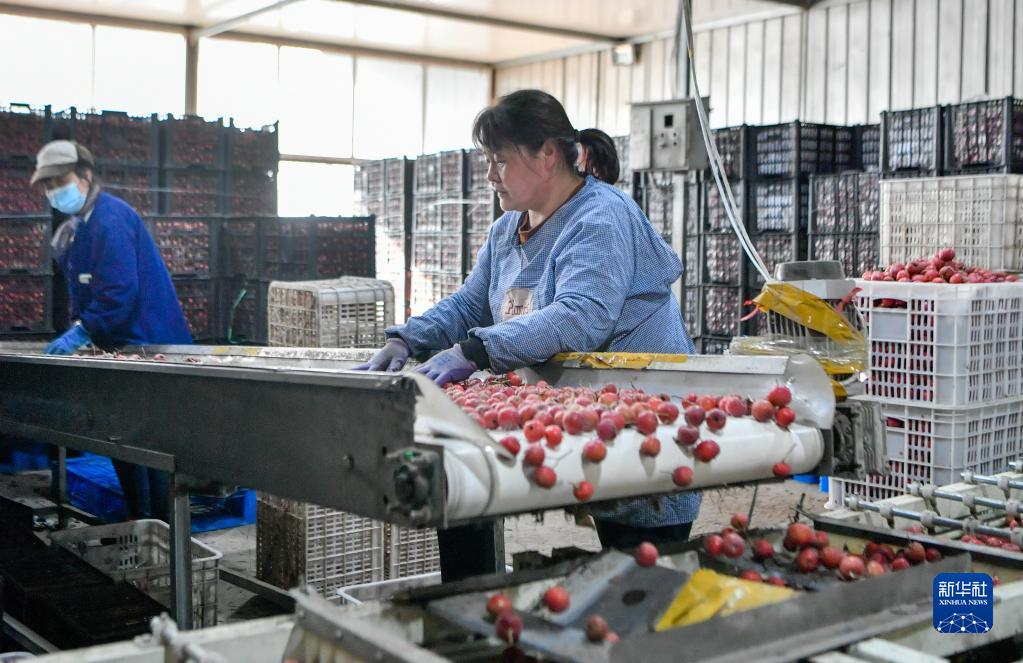 4月6日,在天津市薊州區下?tīng)I鎮野森家庭農場(chǎng),工人對山楂進(jìn)行初篩。