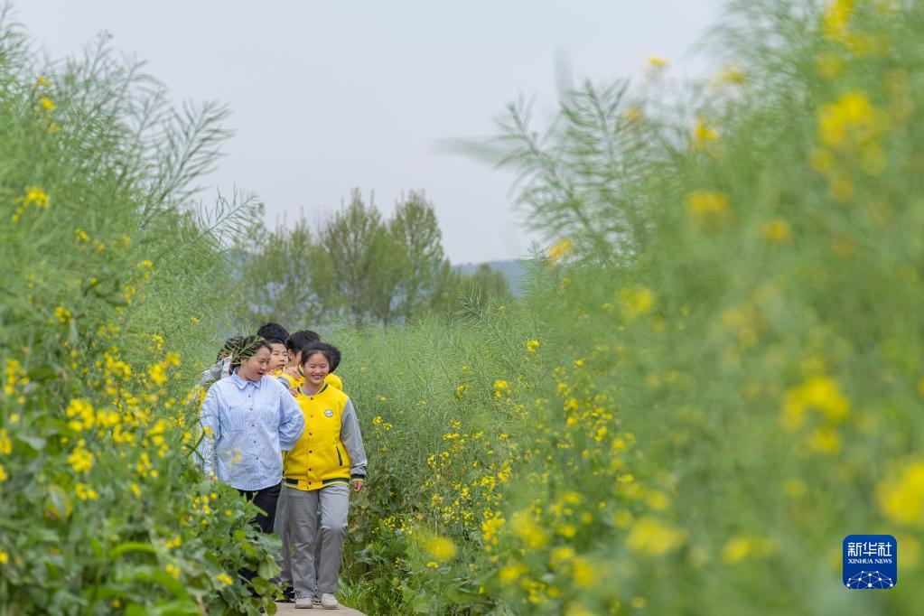 3月31日,在重慶廣陽(yáng)島,重慶市特殊教育中心的視力障礙學(xué)生和老師李英(左一)在油菜田中感受春的氣息。