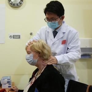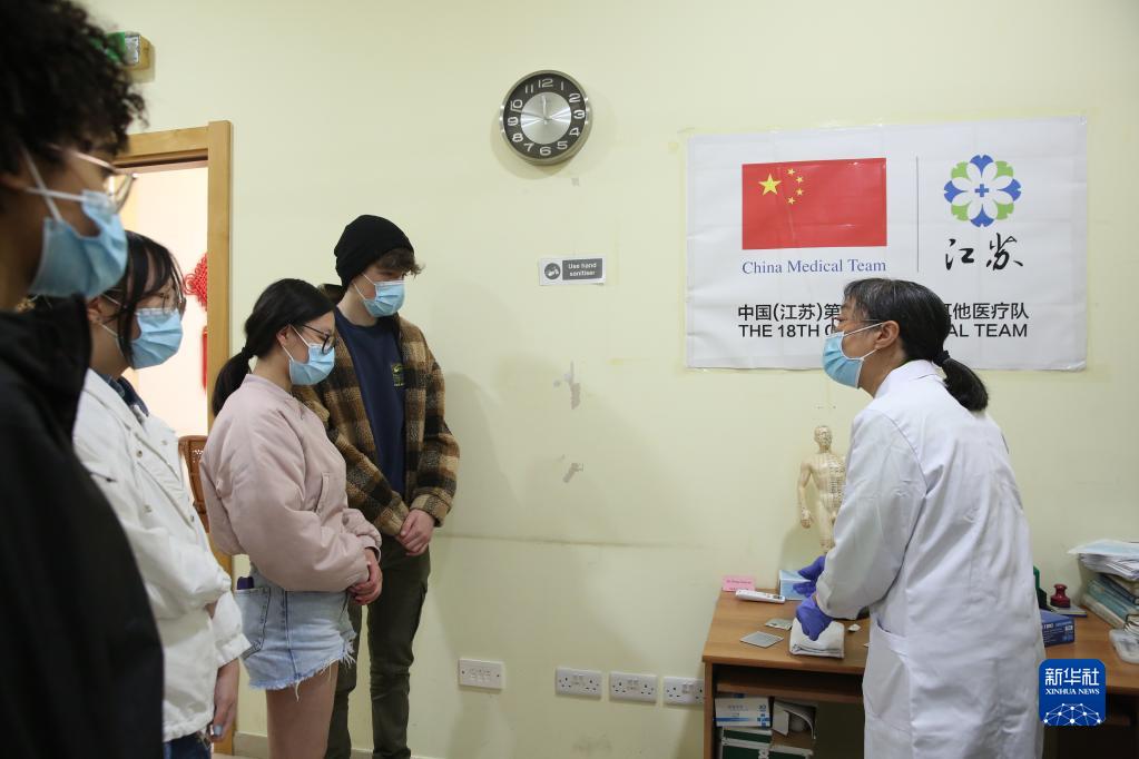 4月5日,在馬耳他保拉市地中海地區中醫中心,中國第18期援馬耳他醫療隊成員給學(xué)生講解針灸治療。