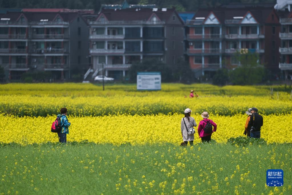 4月7日,游客在新桐鄉盛開(kāi)的油菜花田里觀(guān)賞春色。