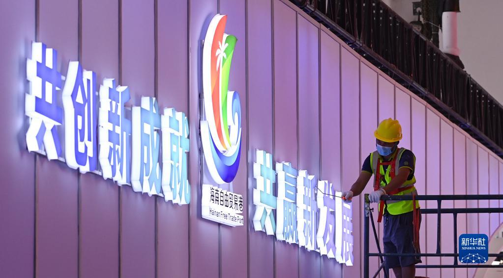 工人在海南國際會(huì )展中心內施工(4月6日攝)。