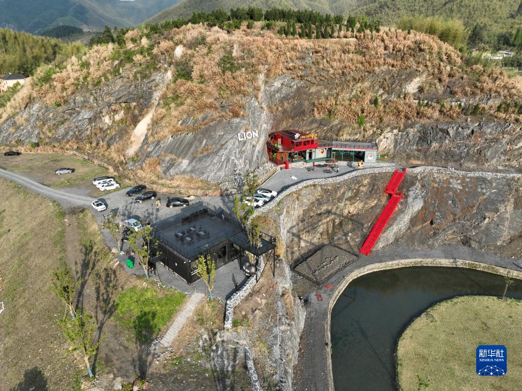 這是安吉縣上墅鄉羅村一處廢棄礦坑旁的兩家咖啡館(4月7日攝,無(wú)人機照片)。