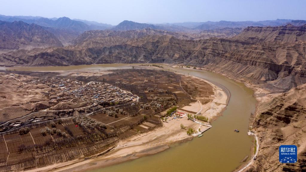 這是4月7日拍攝的寧夏中衛市迎水橋鎮南長(cháng)灘村(無(wú)人機照片)。