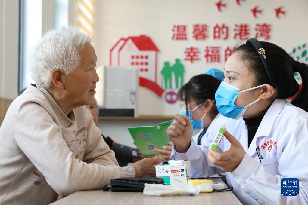 4月7日,河南省焦作市溫縣張羌街道衛生院醫生在當地養老服務(wù)中心指導老人按時(shí)按量服藥。