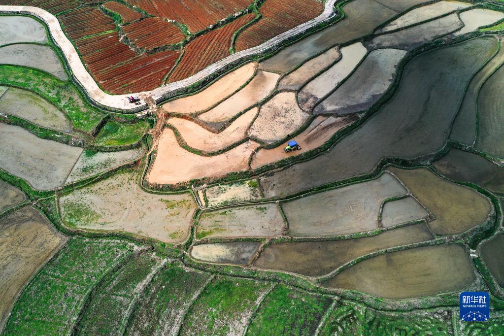 這是4月6日在貴州省岑鞏縣水尾鎮新場(chǎng)村拍攝的雜交水稻制種基地(無(wú)人機照片)。