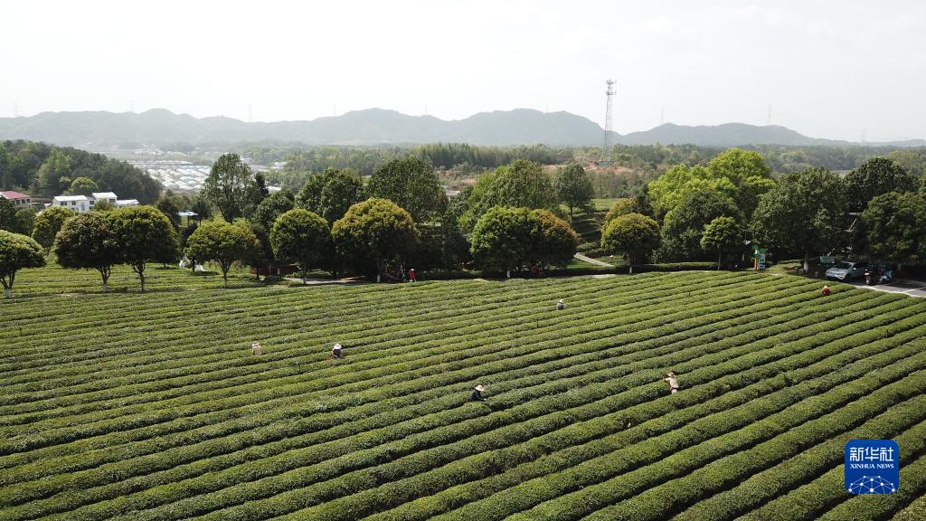 4月7日,茶農在湖南省長(cháng)沙市長(cháng)沙縣金井鎮的金井茶旅融合產(chǎn)業(yè)園采茶(無(wú)人機照片)。