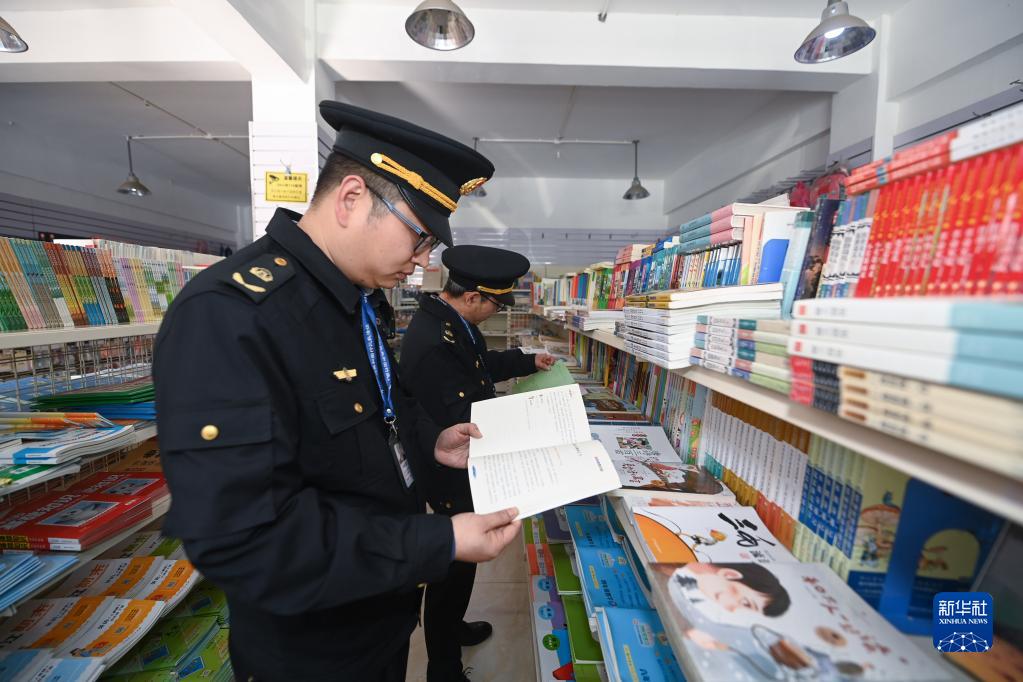 4月7日,諸暨市文化市場(chǎng)行政執法隊的工作人員在校園周邊書(shū)店檢查教輔類(lèi)出版物經(jīng)營(yíng)情況。