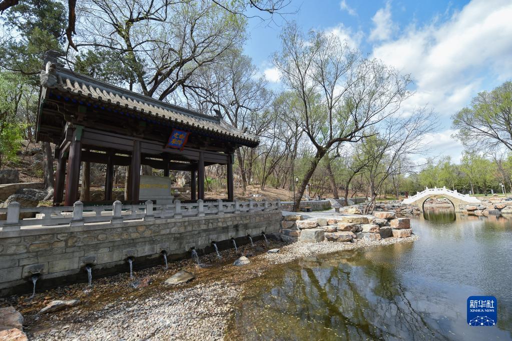 這是4月6日在位于北京市昌平區的大運河源頭遺址公園里拍攝的“白浮之泉”碑亭和九龍池。