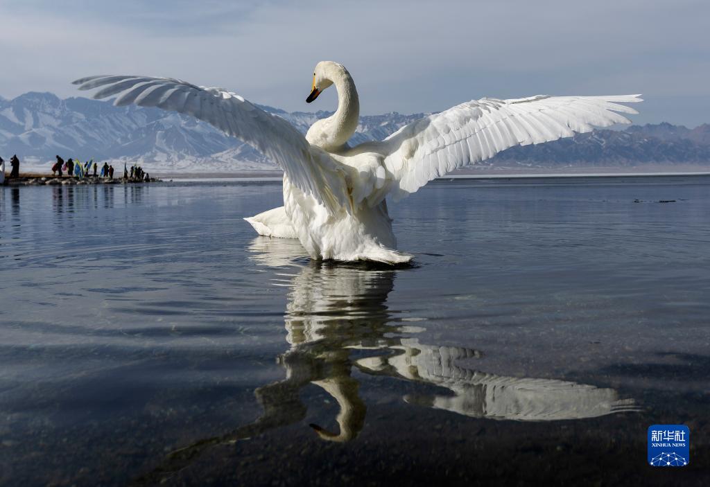 4月6日,一只天鵝在賽里木湖振翅欲翔。