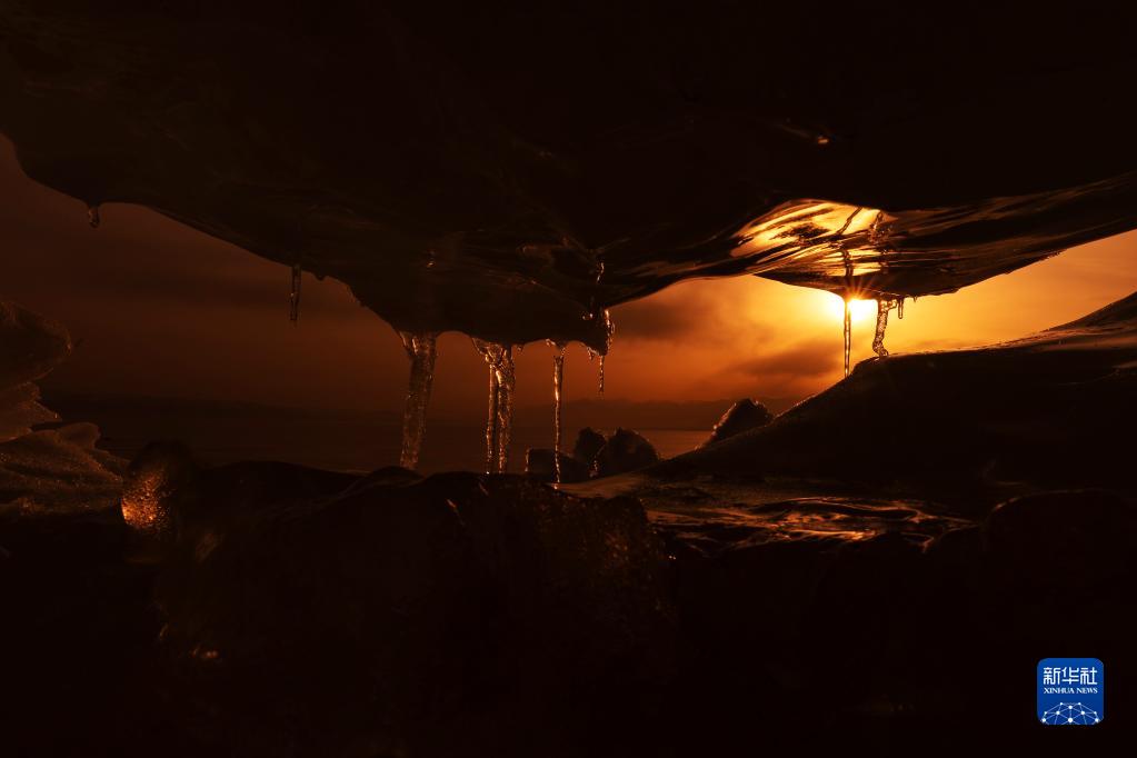 4月6日,賽里木湖畔的冰推在夕陽(yáng)下散發(fā)著(zhù)光芒。