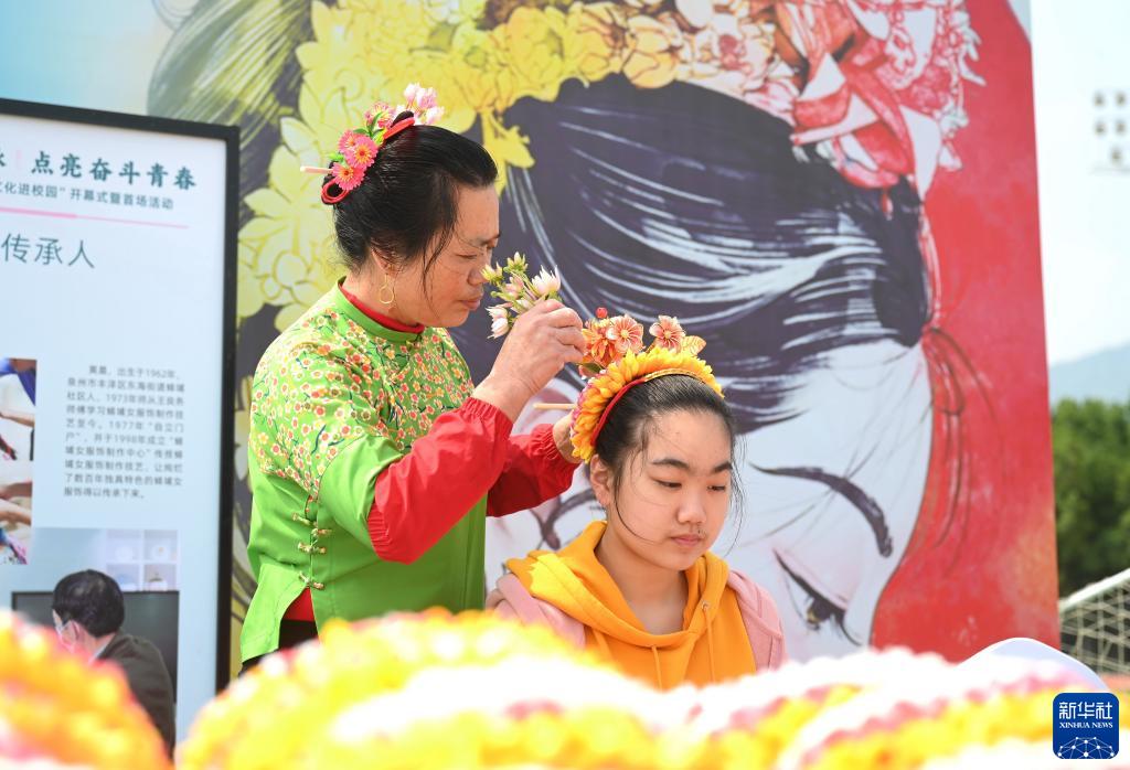 4月8日,泉州蟳埔女在福州大學(xué)城“優(yōu)秀傳統文化進(jìn)校園”開(kāi)幕式上展示國家級非物質(zhì)文化遺產(chǎn)蟳埔女習俗頭飾簪花圍。