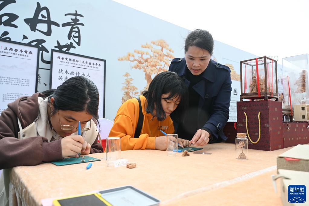 4月8日,軟木畫(huà)傳承人吳奕紅(右)在福州大學(xué)城“優(yōu)秀傳統文化進(jìn)校園”開(kāi)幕式上介紹國家級非物質(zhì)文化遺產(chǎn)福州軟木畫(huà)。