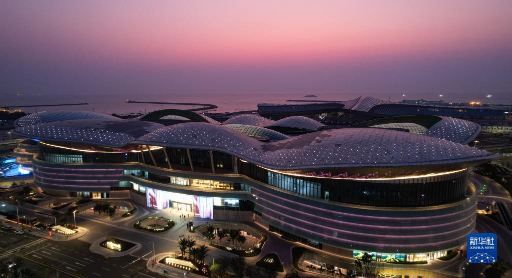 夜色中的??趪H免稅城(前)和??谛潞8劭瓦\綜合樞紐項目(后)(4月4日攝,無(wú)人機照片)。