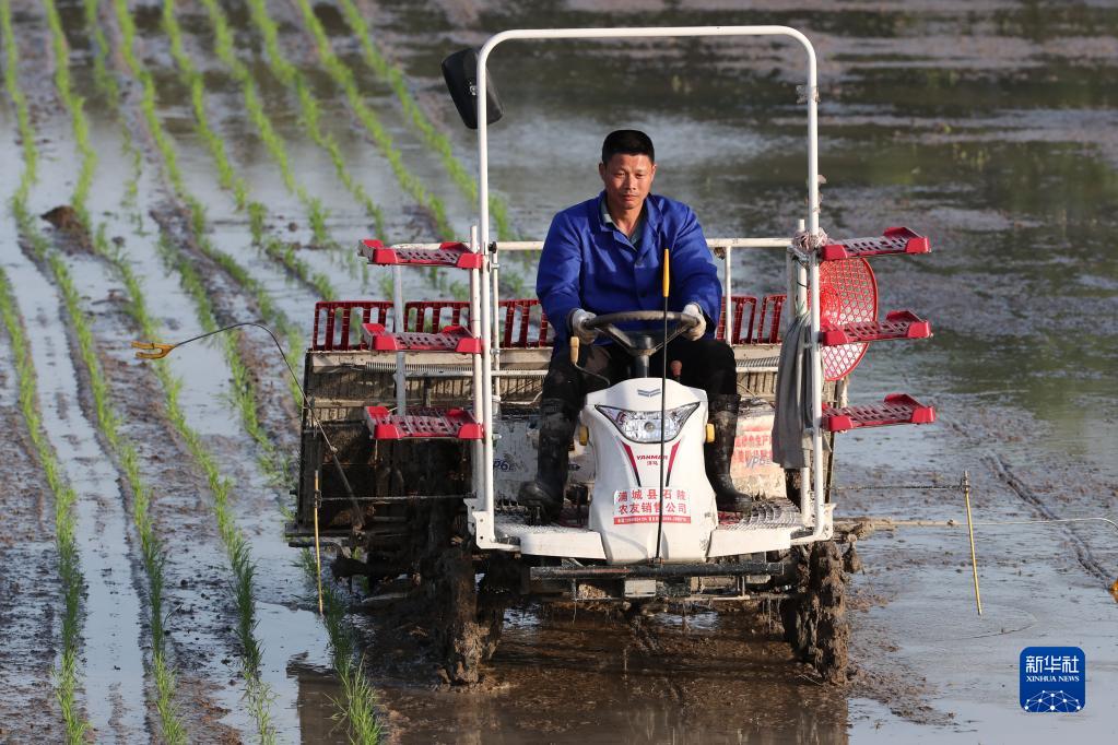 4月7日,在浦城縣石陂鎮,農民駕駛插秧機開(kāi)展再生稻插秧作業(yè)。