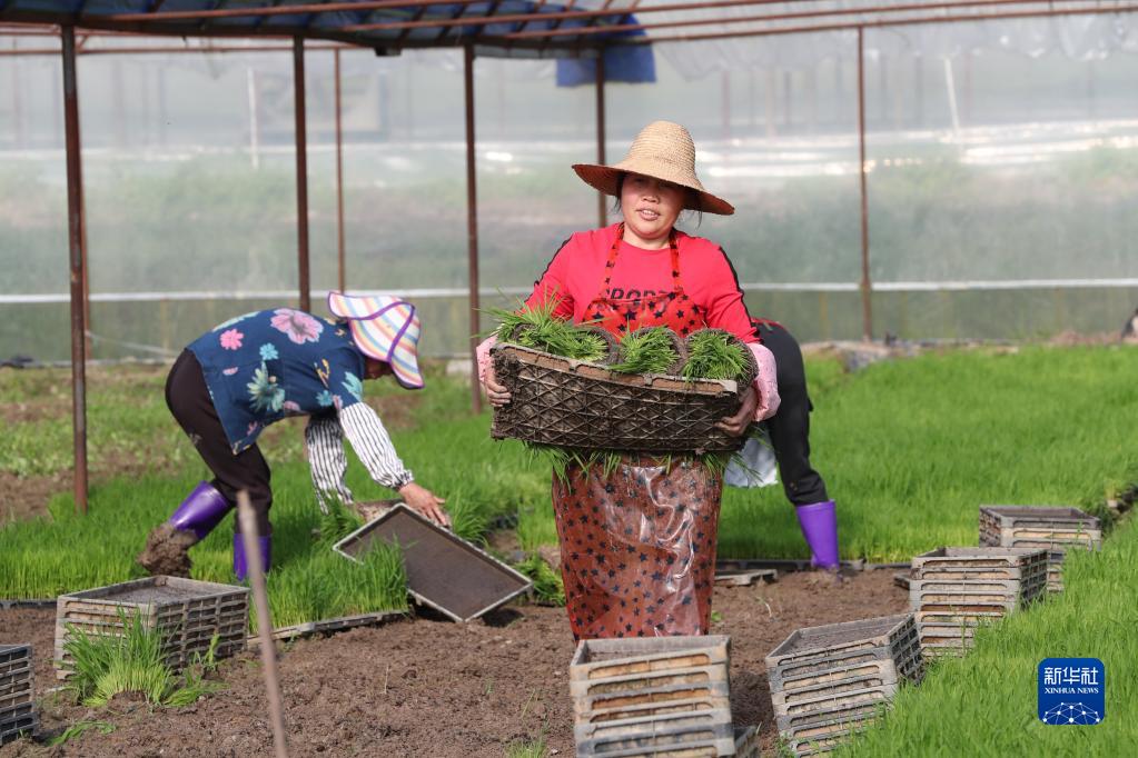 4月7日,浦城縣臨江鎮萬(wàn)鑫家庭農場(chǎng)工人在育苗大棚里搬運再生稻秧苗。