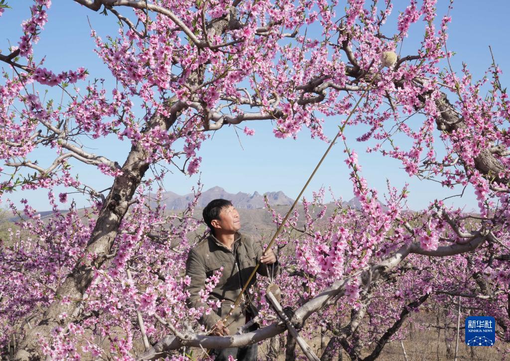4月8日,河北省保定市順平縣臺魚(yú)鄉寨子村的農民在果園給桃花授粉。
