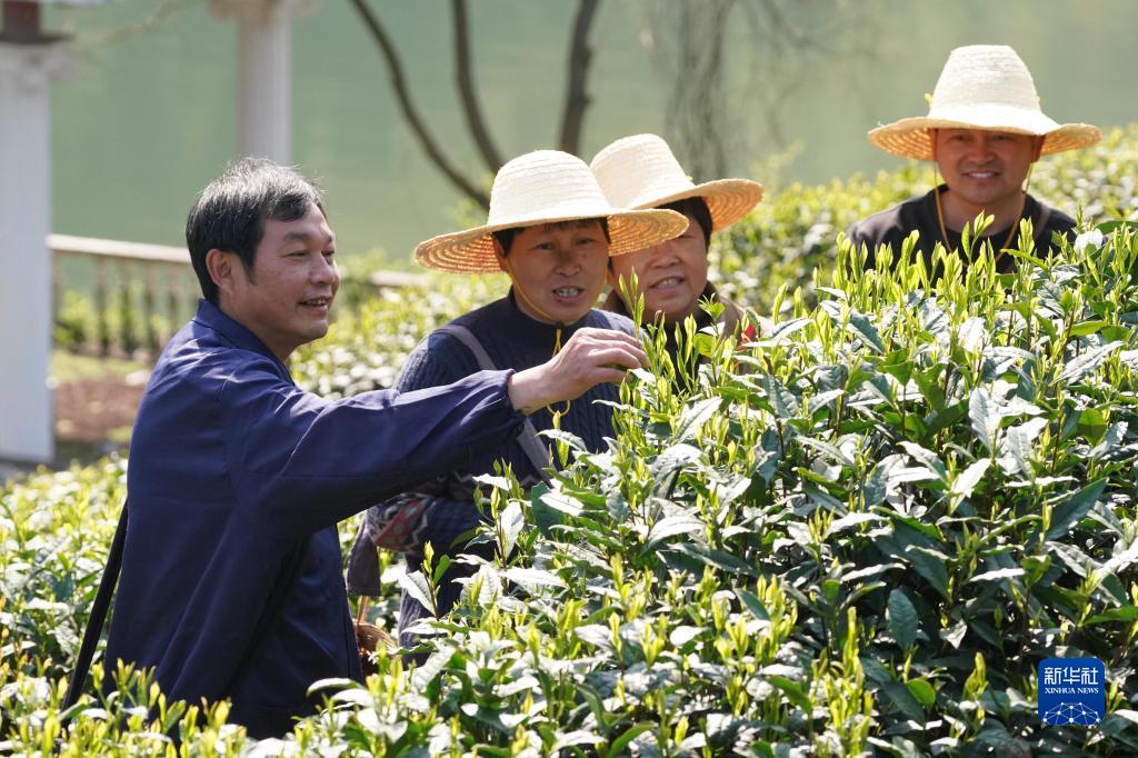 4月8日,在黃山市黃山區新明鄉猴坑村茶園,國家級非遺項目太平猴魁制作技藝代表性傳承人方繼凡(左一)在了解茶葉品質(zhì)。