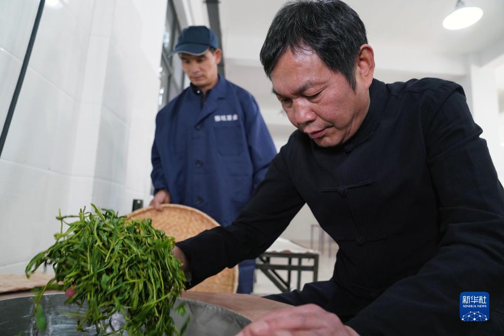4月8日,在黃山市黃山區新明鄉猴坑村,國家級非遺項目太平猴魁制作技藝代表性傳承人方繼凡(右)對試采的早熟茶進(jìn)行殺青。