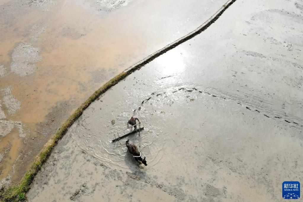 4月8日,在湖南省婁底市雙峰縣井字鎮花橋村,農民趕著(zhù)耕牛平整水田(無(wú)人機照片)。