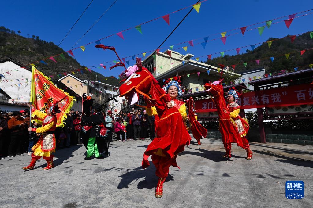 這是2023年3月10日在浙江省杭州市淳安縣屏門(mén)鄉屏前村傳統廟會(huì )上拍攝的竹馬表演。