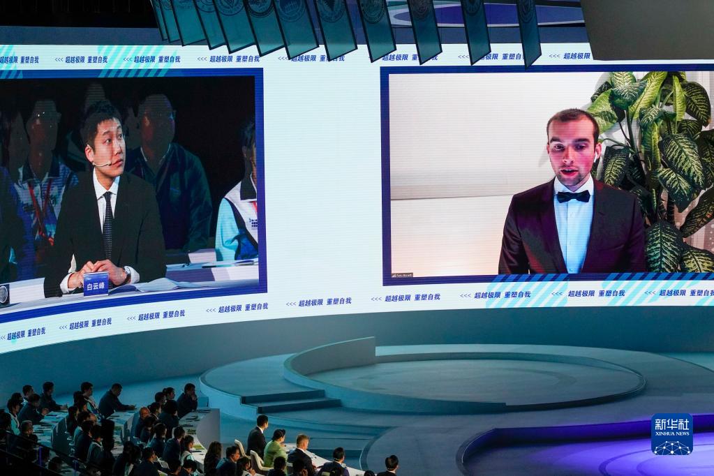 4月9日,蘇黎世聯(lián)邦理工學(xué)院“智子科技”團隊代表(右)通過(guò)網(wǎng)絡(luò )連線(xiàn)的方式回答現場(chǎng)專(zhuān)家的提問(wèn)。