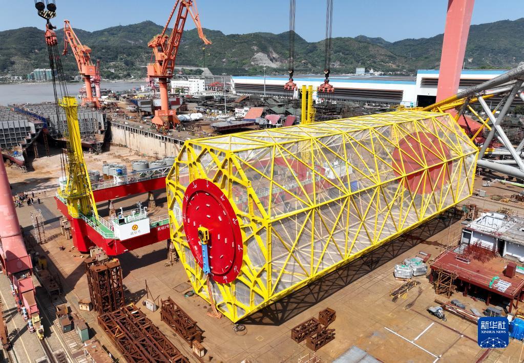 4月9日在馬尾造船股份有限公司總組場(chǎng)地拍攝的“乾動(dòng)2號”深遠海養殖平臺(無(wú)人機照片)。