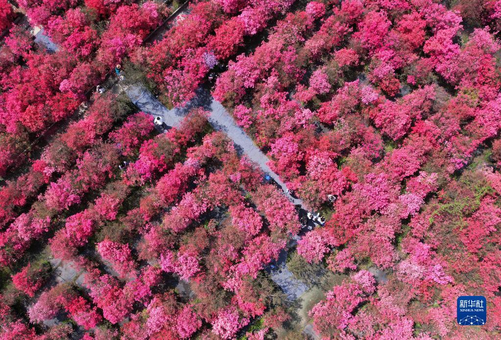 4月9日,人們在江蘇無(wú)錫九龍灣花彩小鎮“杜鵑花迷宮”中游玩賞花(無(wú)人機照片)。