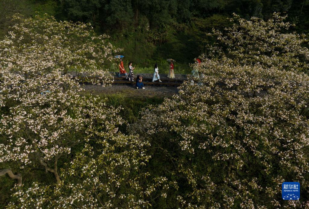 4月9日,游客們在亮水沱站的桐子花叢下徜徉(無(wú)人機照片)。