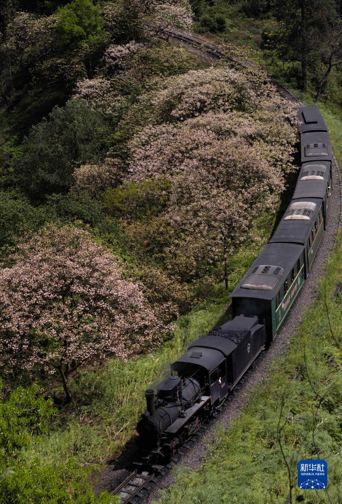 4月9日,一列嘉陽(yáng)小火車(chē)經(jīng)過(guò)亮水沱站的桐子花叢。