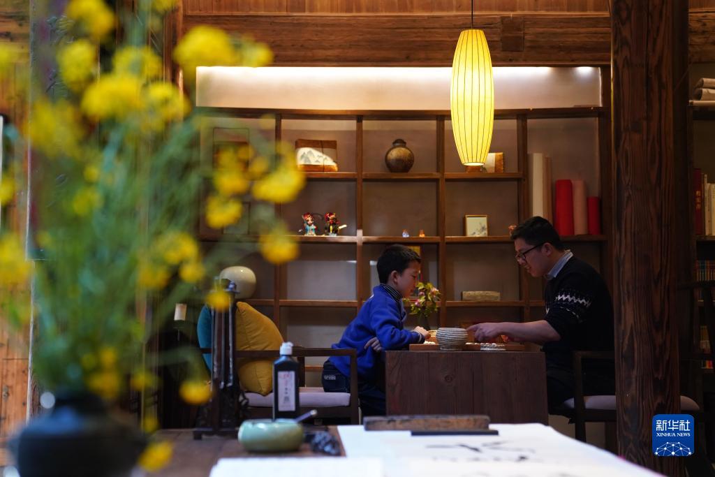 4月9日,在黟縣碧陽(yáng)鎮石亭村的民宿拾庭畫(huà)驛,一對父子在下棋。
