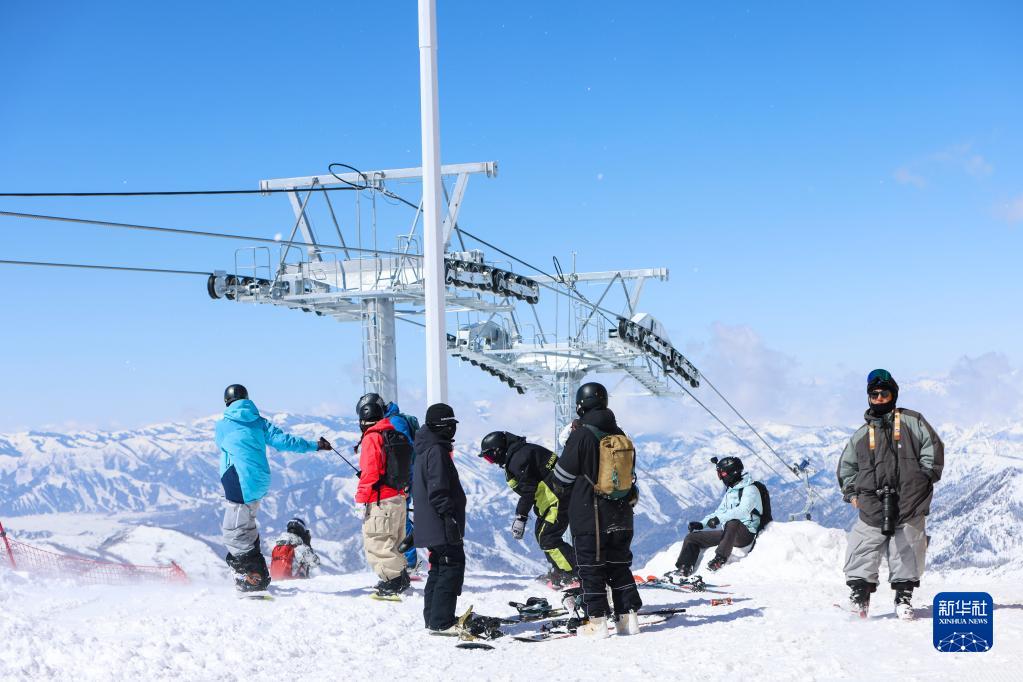 游客在新疆富蘊縣可可托海國際滑雪度假區滑雪游玩(4月9日攝)。