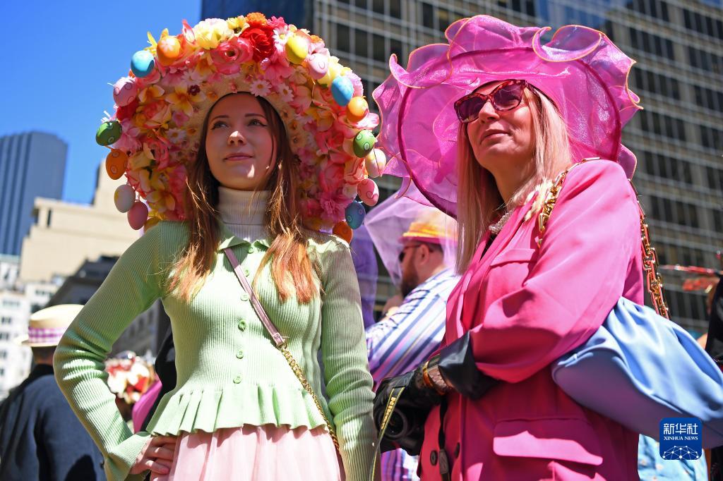 當日是西方傳統節日復活節,人們頭戴精心制作的花帽,在紐約第五大道參加一年一度的復活節游行。