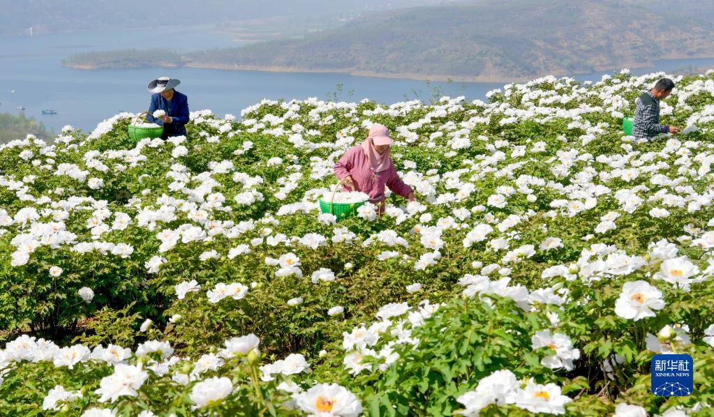 4月10日,在河南省洛陽(yáng)市新安縣倉頭鎮郭莊村牡丹種植基地,花農忙著(zhù)采摘牡丹花。